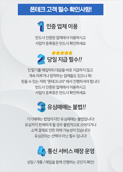 사기피해를 받지 않기 위해서는 폰테크정식등록업체를 이용하시는것이 좋으며, 진행전에 정식등록업체가 맞는지, 유심관리는 어떻게 되는지등을 잘 확인해주시고 업체를 선정하여 진행하시는 것이 좋습니다.
